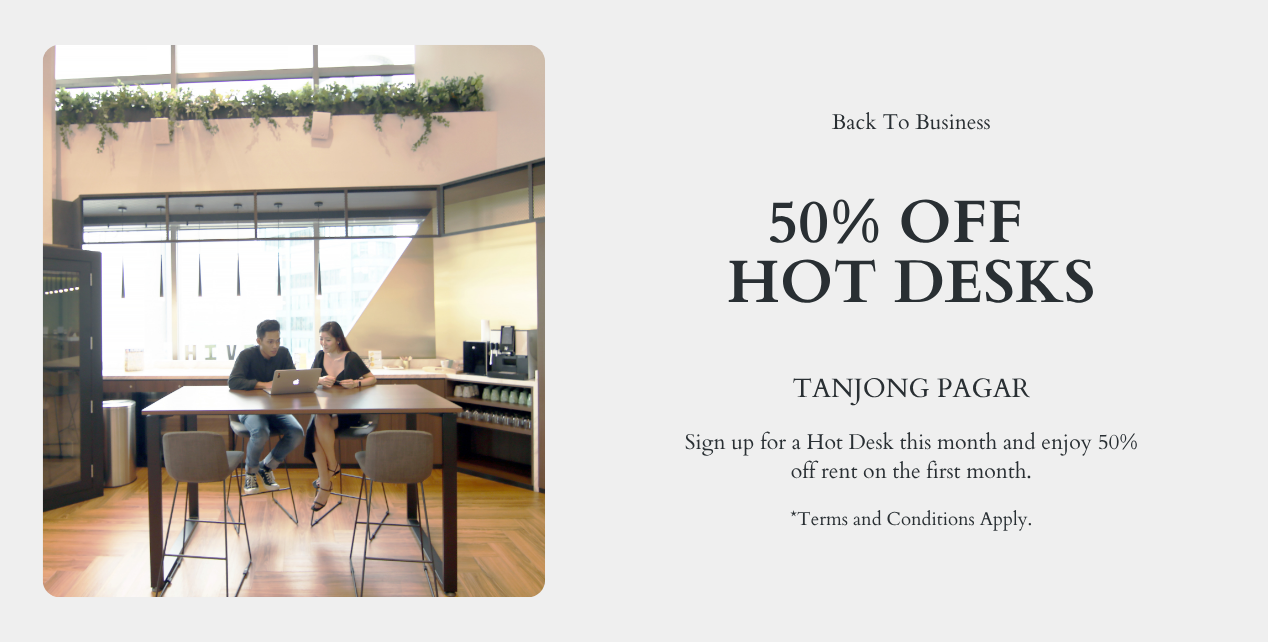Sign up for a Hot Desk this month to enjoy 50% off rent the first month.
